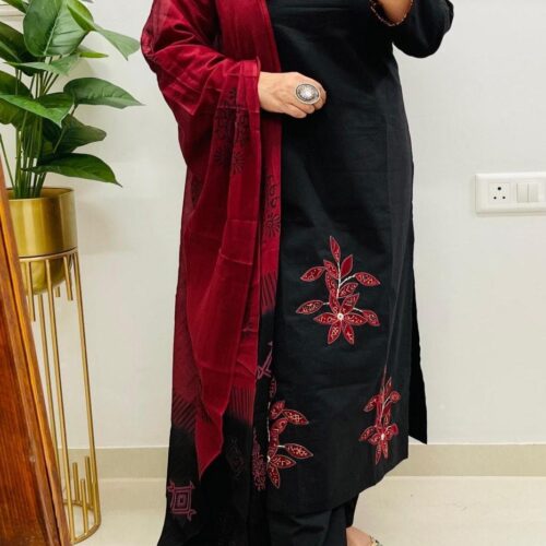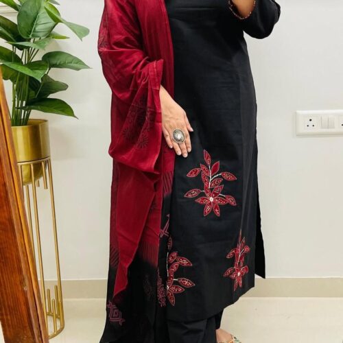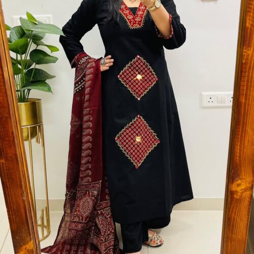 Black Festive Kurti Pant Dupatta Set | 60×60 Cotton | Mirror Handwork Design