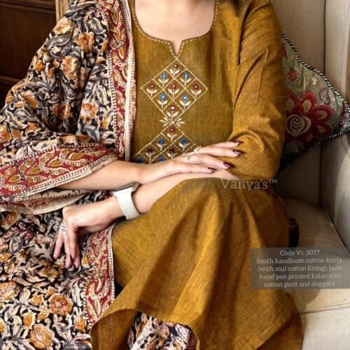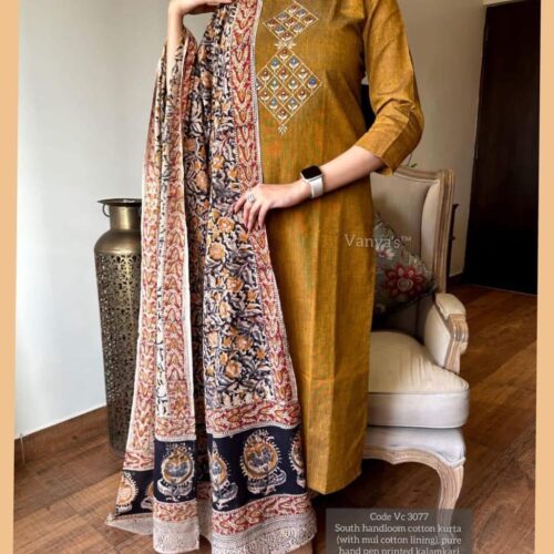 Handloom Kalamkari Cotton Kurti Pant Dupatta Set | Wedding & Festive Wear