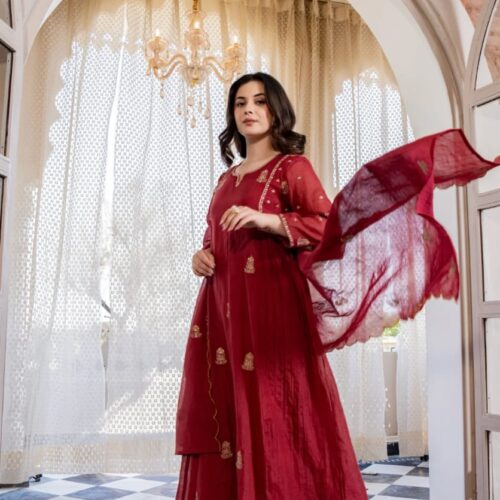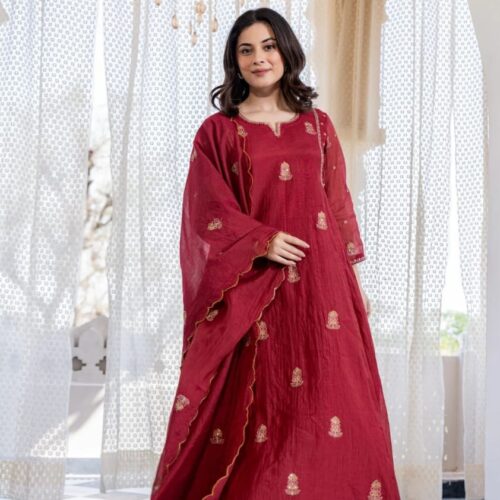 Bandej Anarkali Suit Set – Red & Pink | Festive Special 3-Piece Cotton Set