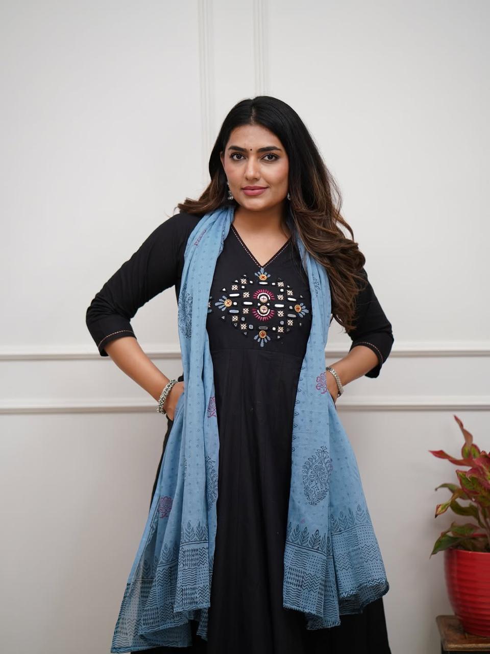Twirl into grace with VanyaLifestyle’s Olive & Black 10-Kali Anarkali Set, a perfect blend of tradition and charm. Crafted from 100% pure cotton (60×60), this Anarkali set features delicate sequin embroidery on the yoke and sleeves, paired with a hand-block printed dupatta that adds a festive flair. Designed for elegance and comfort, it’s the ideal choice for festive celebrations, casual gatherings, and ethnic events.
