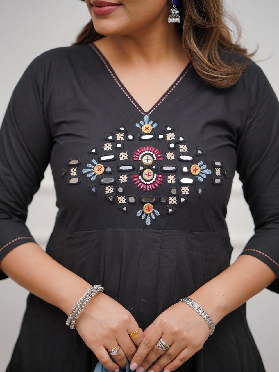 Step into festive charm with this olive and black embroidered Anarkali set. Its timeless color palette and detailed craftsmanship make it a wardrobe must-have. Pair it with silver jewelry and block heels for a complete ethnic look — perfect for Navratri, festivals, and family gatherings.